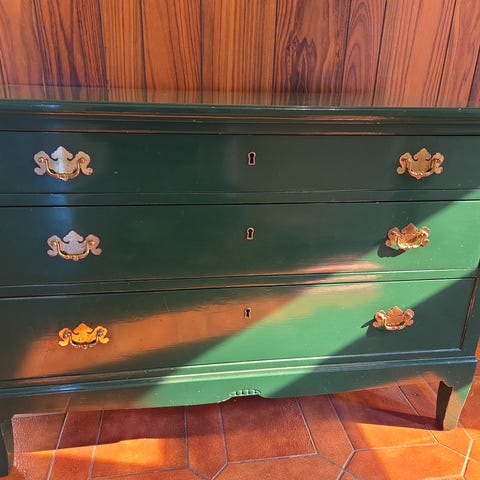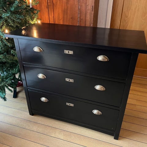 Byrå i svart utförande med flera lådor i olika storlekar. Utrustad med metallhandtag i mässingsfärg.