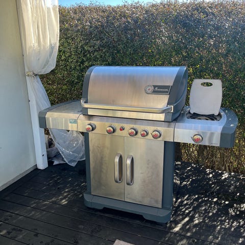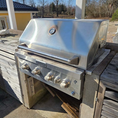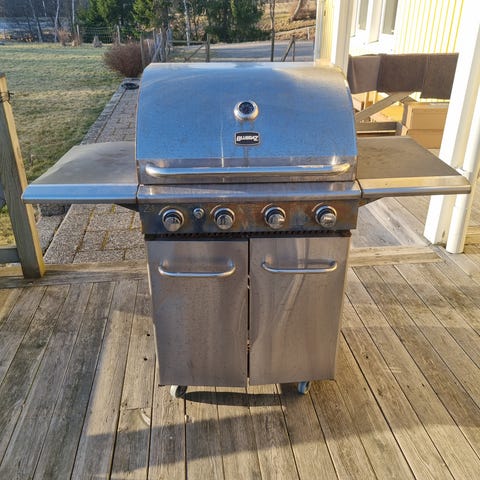 Gasolgrill i rostfritt stål. Grillen har 4st brännare med individuella reglage samt lock med inbyggd termometer. På sidorna finns avlastningsytor för tillbehör och matlagning.
