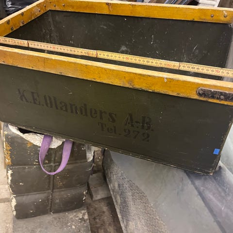 Sockerbolaget trälåda i brunlaserat trä med tryck "Sockerbolaget" och märkning "E Bitsocker Extra 30 kg" på sidorna. Robust konstruktion med sinkade hörn. Lämplig som förvaringslåda eller inredningsdetalj. Mått 460x390 h 300. Helt omålad. Pris 300.-