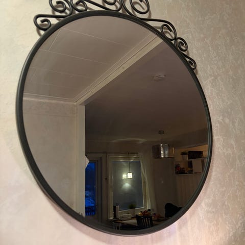 Säljer en stilren och dekorativ spegel med svart metallram i smidesdesign. Perfekt som inredningsdetalj i hall, sovrum eller badrum. Spegeln har en praktisk liten hylla nedtill – perfekt för smycken, smink eller småprylar.