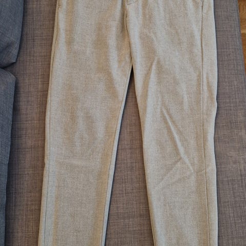 Byxor för herr i storlek S. Tillverkade i polyester och i beige färg. Modellen har resår och dragsko i midjan samt smalare ben. Passar som vardags- eller fritidsbyxa.