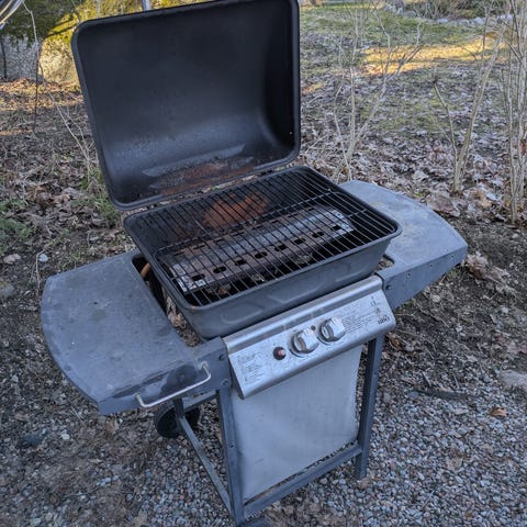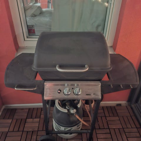 Gasolgrill i rostfritt utförande med flera brännare och sidobord. Grillen har lock med inbyggd termometer och två dörrar framtill för förvaring av gasolflaska eller grilltillbehör. Passar för utomhusbruk i trädgård, på altan eller uteplats.En buckla på handtaget.finns i Nacka nära Forum.nypris 9000kr.