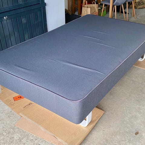 IKEA Skårer resårmadrass i vit färg. Madrassen har quiltad tygklädsel runt om och är avsedd att användas tillsammans med sängram eller sängstomme med ribbotten. Passar som vanlig sängmadrass i sovrum eller gästrum. Tvättråd och skötselinformation finns på etiketten på sidan av madrassen.