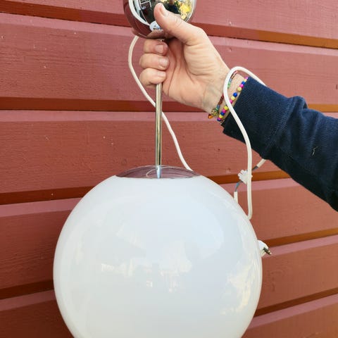 Klotlampa i metall med kupa i opalvitt glas.