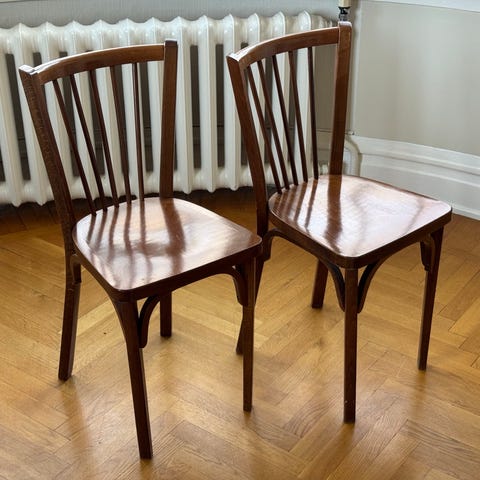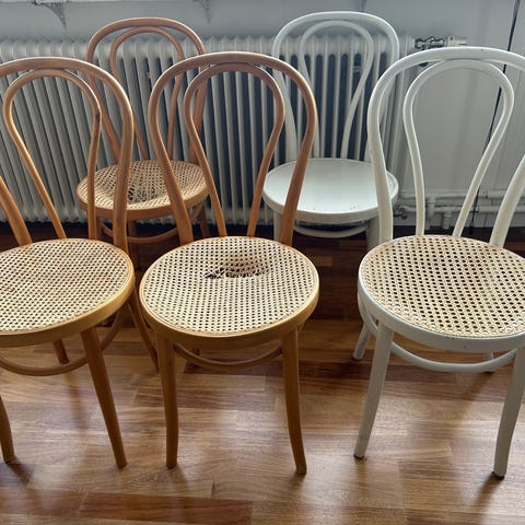 Fyra Thonetstolar i gott använt skick. Namnet Thonet är brännmärkt i sargen. Renoverade av möbelsnickare. Höjd i ryggen 91,5 cm.
