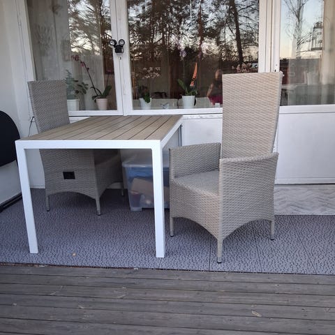 Mio bord för utomhusbruk med rektangulär bordsskiva i glas och underrede i grå konstrotting. Bordet står på fyra ben i metall och är anpassat för exempelvis balkong, uteplats eller trädgård. Passar som matbord eller avlastningsbord i utemiljö.