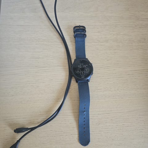 Garmin Approach S40 golfklocka i svart med silikonarmband. Klockan är utformad för golf och visar bland annat avstånd till green och hinder direkt på skärmen. Den har rund urtavla, digital display och flera knappar på sidan för navigering i menyerna. Armbandet har klassiskt spänne med flera hål för justerbar passform. Till klockan ingår en USB-laddkabel för laddning via dator eller nätadapter. Produkten är lämplig för användning på golfbanan samt som vardagsklocka med aktivitetsfunktioner.