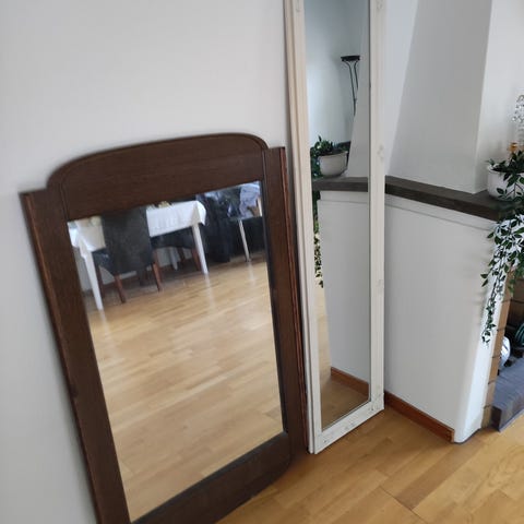 Gammal spegel med förvaringslåda under. Transporteras i tre delar. Total höjd 255cm och nederdelen är 90cm bred, själva spegeln 80cm.
