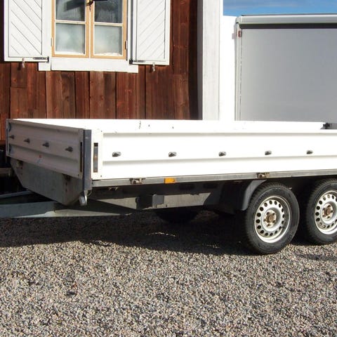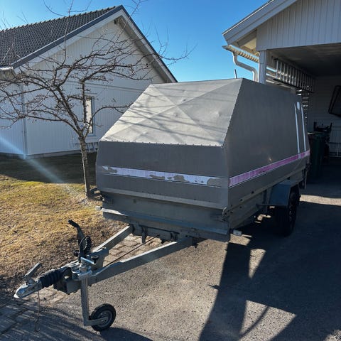 Släpvagn med kapell. Vagnen har gallergrind baktill och täckande kapell över lastutrymmet. Utrustad med bakljus, reflexer och dragkrokfäste. Passar för transport av olika typer av gods som behöver skyddas mot väder och vind.Vinterdäck och sommardäck följer med.Totalvikt 1350 kg, aluminium vagn,lastutrymme längd 3,57m bredd 2,22m, Släpvagnen är med påskjutsbroms och stötdämpare. Invändigt mått är 3,43x1,75m.