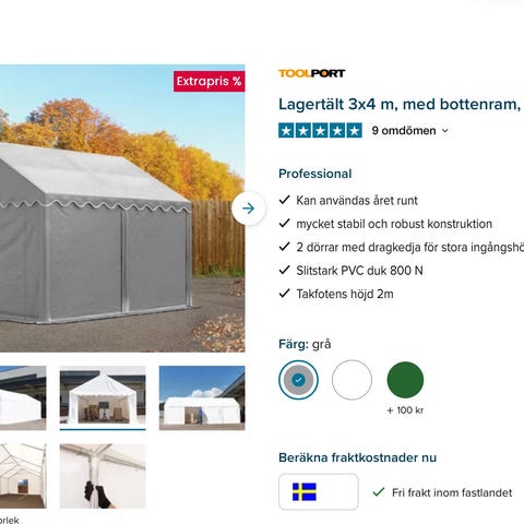 Dancover Pro med golv. 3,6 x 6 meter, höjd 2,7 m. Kraftig PVC duk 500g/kvm. Kraftig bra stomme. Kostade 12 tusen när jag köpte den ny för 2 år sedan. Kommer att plocka ihop den om nån vecka, Finns i Kallfors i järna