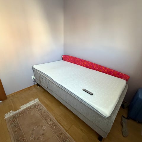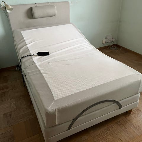 Välfungerande höj- och sänkbar säng, 120x200 cm. Kan höjas/sänkas i både huvud- och fotända.