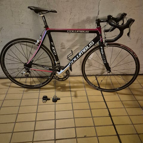 Racercykel med carbonram och tävlingshjul. Passar längd 172-178 cm. Kontakta gärna via SMS. 0705-82 69 01, Pentti