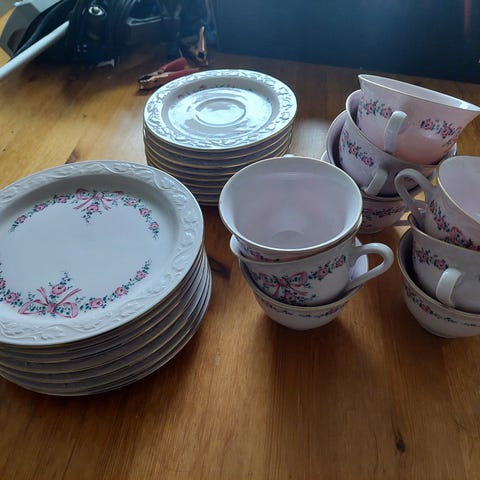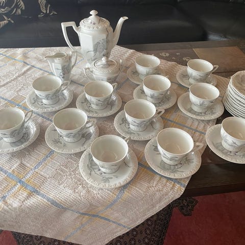 Servisen inkluderar 11 kaffekoppar, 11 fat och 11 assietter.