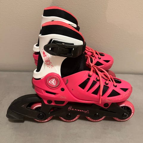 Rullskridskor inlines för barn i storlek 36,5-40,5. Modellen är justerbar i flera storlekar enligt markering på sidan. Skorna har hårt yttre skal med spänne och kardborreband för att ge stöd runt fot och fotled. Färgkombination i svart, vitt och rosa med fyra hjul per skridsko. Passar för åkning på jämna underlag som asfalt och andra hårda ytor. Sparsamt använd, fint skick.