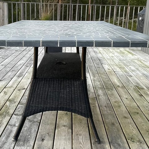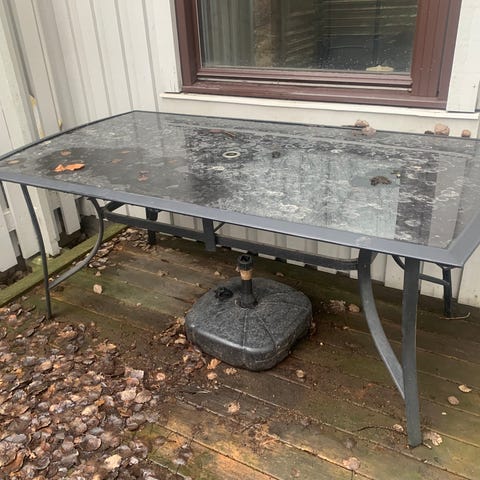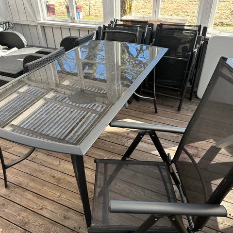 Utemöbler, bord med glasskiva och 4 stolar. Stolar med metallstomme och sits/rygg i nätmaterial.