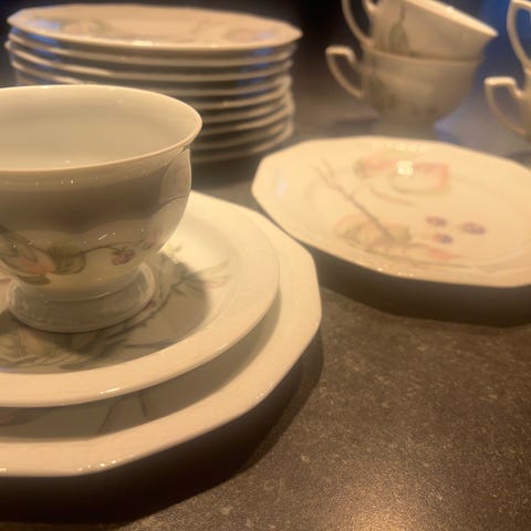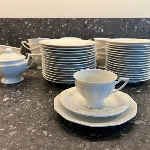 Innehåller totalt 43 delar varav 12 koppar, 12 fat, 12 assietter, 2 serveringsfat, 1 sockerskål med lock, 1 grädd/mjölkkanna och 1 kaffe/tekanna med lock.