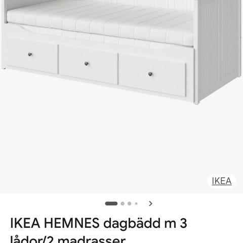 IKEA HEMNES dagbädd med måtten 80x200 cm. Dagbädden är vit och har tre utdragslådor under liggytan för förvaring. Modellen levereras med två madrasser av typen Åfjäll medium fast. Kan användas som enkelsäng, extrasäng eller sittmöbel beroende på behov och placering i rummet.