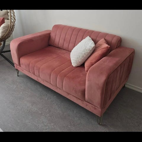 Säljer en stilren och rymlig 2-sitssoffa i blått tyg.