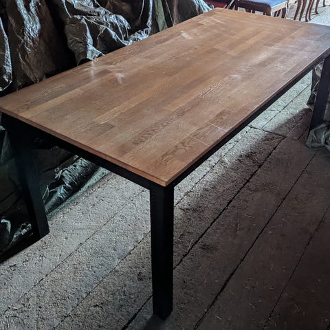 Matbord 200x90 cm, två tilläggskivor till kortsidorna och 6 st solar.