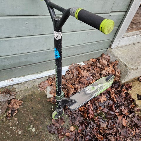 Sparkcykel i trickmodell i svart färg. Utrustad med två små hjul anpassade för trickkörning samt robust deck och styrstång. Handtagen är raka med greppvänligt material. Passar för åkning i skatepark eller på plana underlag. Ingen höjd- eller storleksangivelse finns, se bilder för utförande och detaljer.