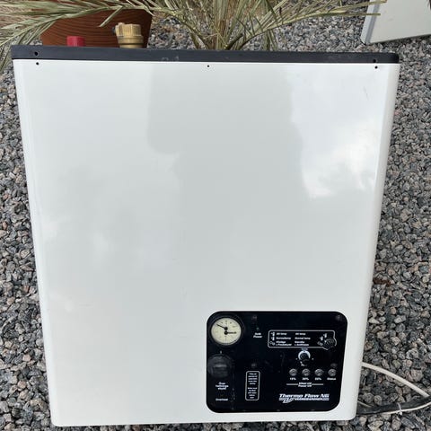 Värmebaronen Elomin 3 elpanna för uppvärmning av vattenburna system. Utrustad med manöverpanel med effektlägen upp till 13 kW enligt frontmärkning, temperaturmätare samt reglage för inställning av drift. På baksidan finns anslutningar för vatten och el samt inbyggd tryckkärlsdel.
