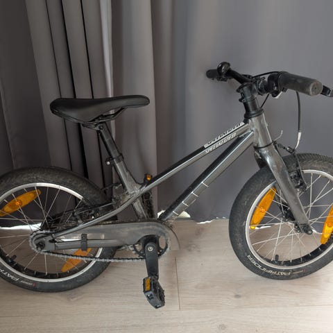 Specialized Hotrock med 16" hjul. Cykeln är i bruksskick och har slitage från två barns framfart. Kedjeskddet är lite löst men går att fixa enkelt. En perfekt första cykeln när stödhjulen åker av.