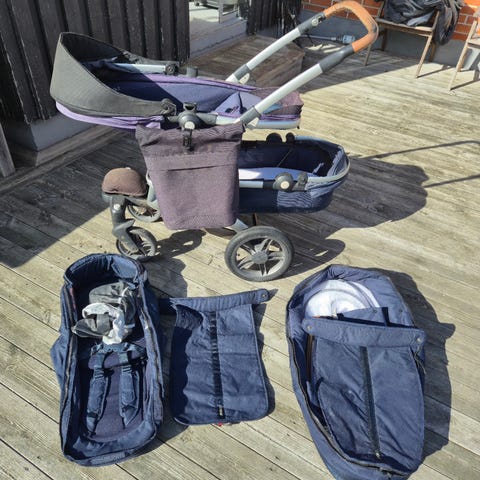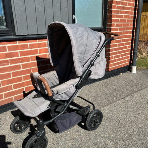 Joolz syskonvagn i grön färg. Vagnen har två sittdelar och två liggdelar som kan användas samtidigt för två barn. Framhjulet är svängbart och bakhjulen är större för stabilitet. Handtaget har överdrag i läderimitation. Sittdelarna har justerbart ryggstöd och sufflett. Passar för vardagsbruk, promenader i stadsmiljö och enklare terräng.
