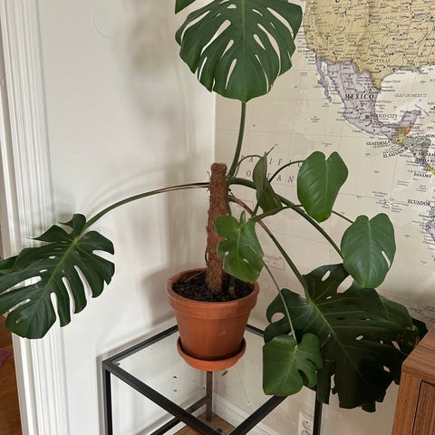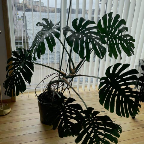 Stor Monstera deliciosa krukväxt i grönt. Växten har stora, flikiga blad och odlas i kruka inomhus. Passar som större grönväxt i rum med indirekt ljus. Kräver regelbunden vattning och trivs i normal rumstemperatur. Levereras i befintlig innerkruka. Behöver omplanteras.