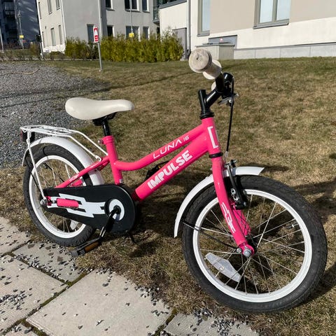Scott barncykel med 16" hjul i rosa och vitt. Utrustad med kedjeskydd, skärmar och stödpinne/barnstång baktill för att en vuxen ska kunna hjälpa till att styra och skjuta cykeln. Passar för barn som behöver en mindre cykel med 16-tums hjulstorlek.