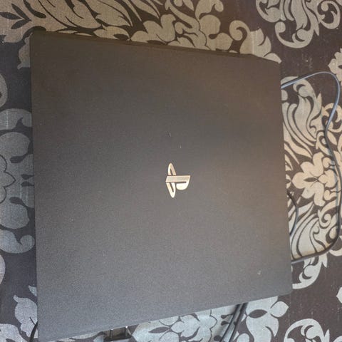 Sony Playstation 4 slim 1tb spelkonsol med flera DualShock 4-handkontroller i olika färger samt ett urval av PS4-spel. Konsolen har anslutningar för ström, HDMI, nätverk och USB enligt standard för Playstation 4.
