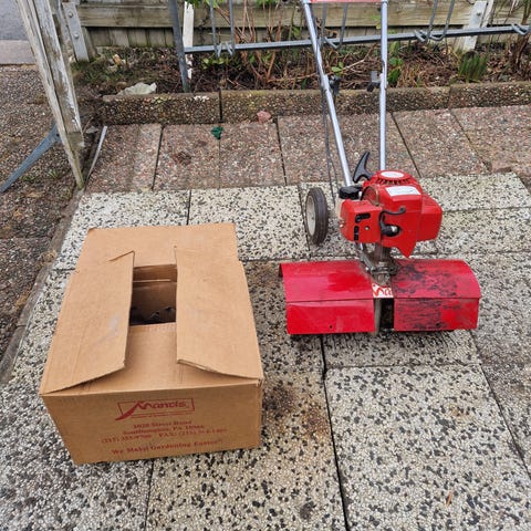 Briggs & Stratton jordfräs med bensinmotor. Utrustad med hjul för enklare förflyttning och fräsknivar för bearbetning av jord i trädgårdsland och rabatter. Lämplig för uppfräsning av odlingsbäddar och förberedelse av mark inför plantering.