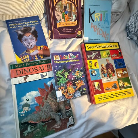 Skänker en kasse med barnböcker. Det är varierade titlar främst för åldrarna 3-6 år.