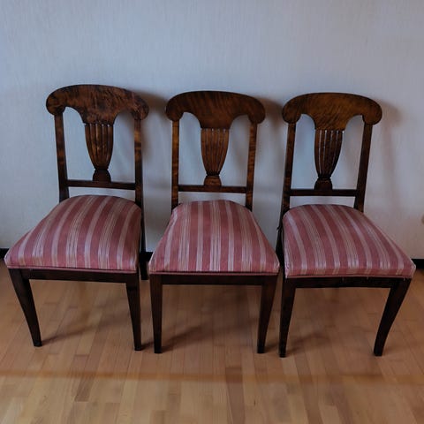 Mycket fint skick. Har 8 st 250 kr st! Robusta använda endast i extrarum. Träslaget är ek ! Har även extradynor i bast.