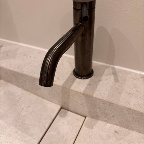 Rektangulärt tvättställ i vitt porslin med plan kant runtom. Handfatet har ett centrerat avlopp med runt hål. Medföljer PRIMY blandare monterad på en upphöjd del av handfatet. Passar för montering ovanpå bänkskiva i badrum eller toalett.