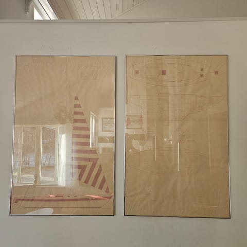 4 st. tavlor set med figurmotiv i smala, rektangulära ramar. Motiven föreställer stiliserade, stående figurer i starka kontrastfärger som rött, blått, grönt och orange. Tavlorna är inramade med guldfärgade ramar och har vit passepartout. Passar som väggdekoration i exempelvis vardagsrum, hall eller sovrum. En av tavlorna har spricka i glaset, vilket syns på bilden.
