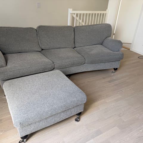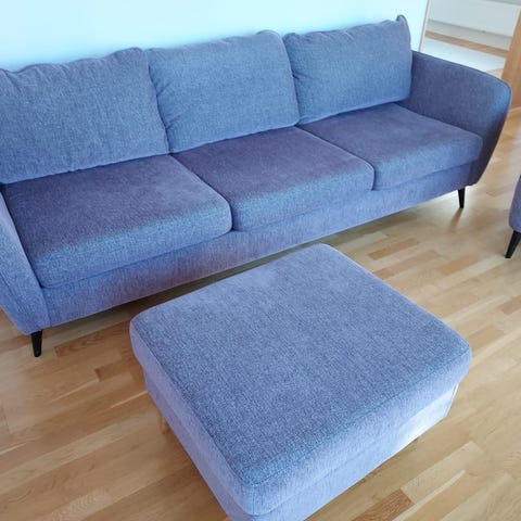 En fin mörkgrå soffa med tillhörande fotpall från Stalands. Köpt år 2012, välanvänd men i bra skick. Hel och ren.