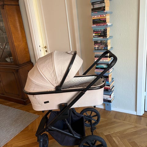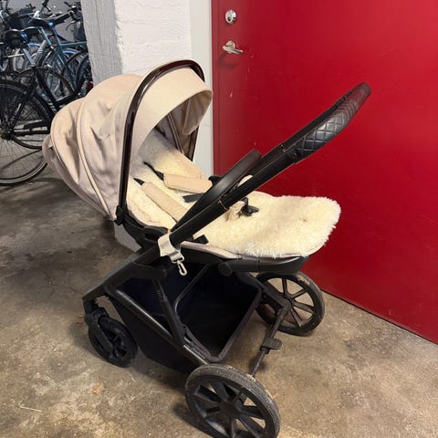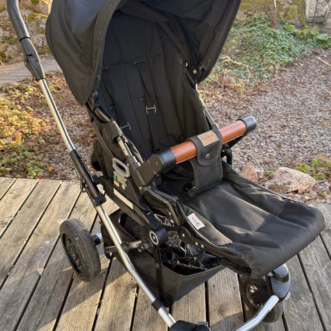 Trevlig sittvagn med pumpade däck. Den är skön att köra och skön för barnet att sova i. Det går bra att sätta på en ståbräda efter den och den har ett stort förvaringsutrymme i korgen under. Välfungerande regnskydd medföljer. Lätt att fälla ihop.