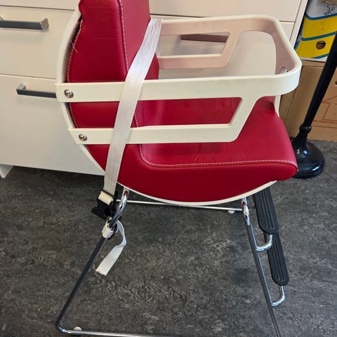 Säljer en snygg barnstol från BRIO i modern och tidlös design. Stabil kromad stålstomme med bekväm sits i orange konstläder och vita armstöd med BRIO-logga.