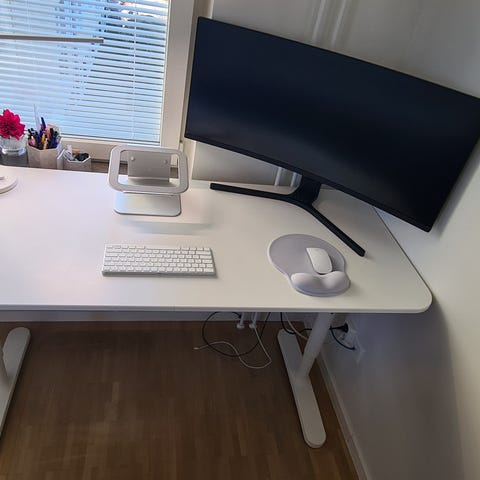 Detta stabila och stilrena skrivbord är perfekt för både kontors- och hemmabruk. Med sin minimalistiska design och justerbara benhöjd 650-850mm ej elektriskt. Passar Bekant utmärkt i alla typer av arbetsmiljöer. Bordet har bordsskiva i brun-grå med rundade hörn och svart stativ.