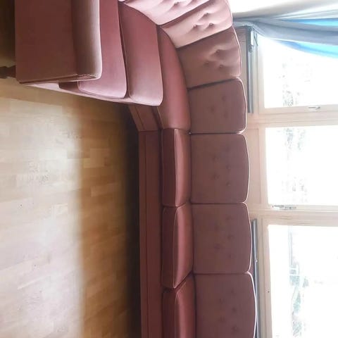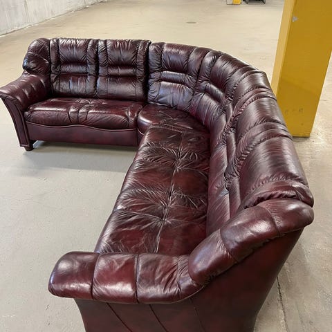säljer en hörnsoffa som har spår av användning och lite slitage