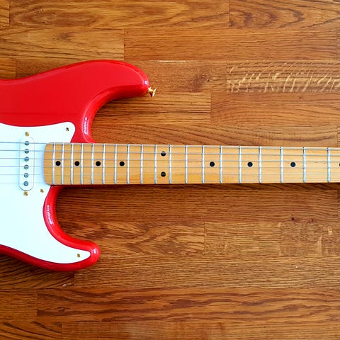 Fender Stratocaster, pigg 50-åring tillverkad i USA, troligen 1976 eller 1975. Hals och greppbräda i lönn. Omlackad. Flera detaljer är inte orginal: plektrumskydd, bakplatta, Schaller mekanismer, Seymour Duncan single-coil mikrofoner. Låter mycket bra.