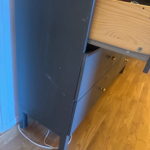 Byrån är i mycket fint skick. Lådorna behöver monteras. Det finns ett litet hål (se bilde) och den nedre delen har monterats lite fel (man ser brune fargen, men skulle vises svarte)