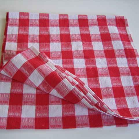 Jättevacker duk i vävt tyg med broderat mönster i blått och vitt och med hålsöm.