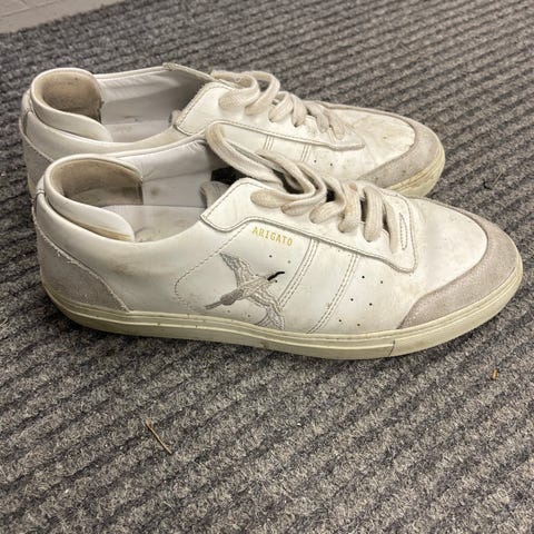 Axel Arigato sneakers i storlek 44. Skorna är huvudsakligen vita med gröna detaljer på sidorna, beige mockaliknande partier och mönstrad häl. Lågskaftad modell med snörning och gummisula. Passar som vardagsskor eller fritidsskor.