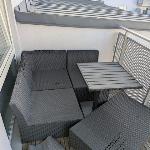 Medföljer gör grå sittdynor samt ett blått parasoll som kan enkelt fästas på tex ett balkongräcke.