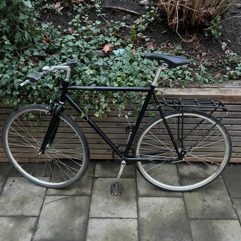 Cykeln har röd ram med lågt insteg, svart pakethållare bak och skärmar fram och bak. Utrustad med upprätt styre, handbromsar och växlar. Passar för pendling och vardagscykling på väg och cykelbana.