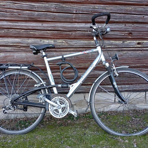 2 nycklar, brun, något år gammal men väldigt lite använd. Jag har köpt elcykel därav behövs den inte längre. Ramstorlek 550 vilket förr väl var detsamma som 55. Som den är på bilen är brukaren 188 cm lång
