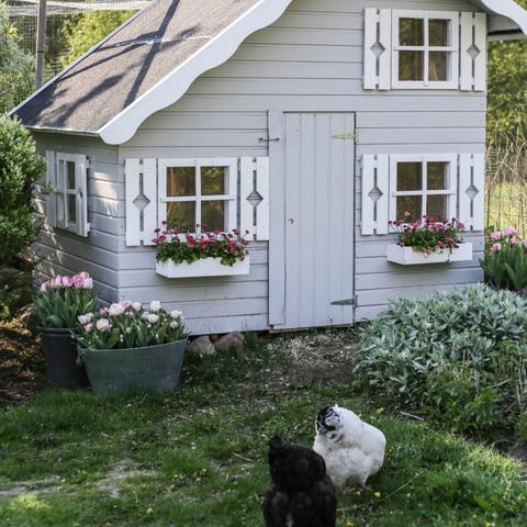 Stugan har många charmiga detaljer som fönster med hjärtform, liten veranda, brevlåda samt dekorativ skorsten och väderflöjel på taket. Invändigt är den ljus, trivsam och smakfullt inredd med målade väggar och golv, barnmöbler och smart förvaring.