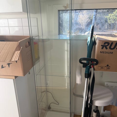Säljer ett vitt vitrinskåp i gott skick. Perfekt för förvaring och display av glas, porslin eller dekorationer. Passar bra i mindre utrymmen tack vare sitt smidiga format.