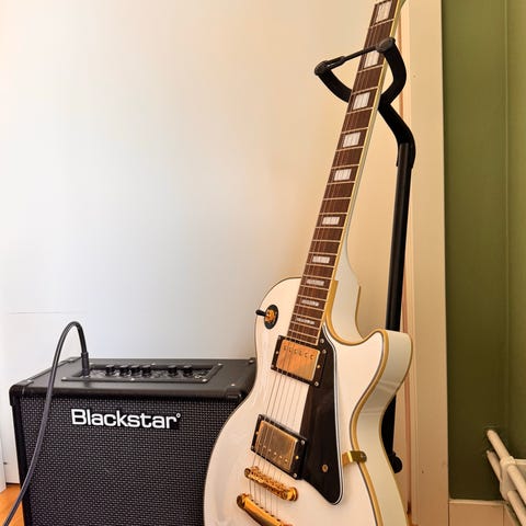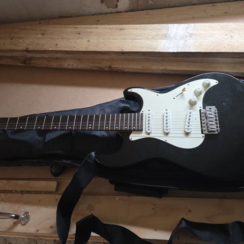 Säljer min gamla rockson les paul el gitarr som saknar en E string men allt annat funkar. När du köper den så får du med dig en högtalare som fungerar med gitarren.